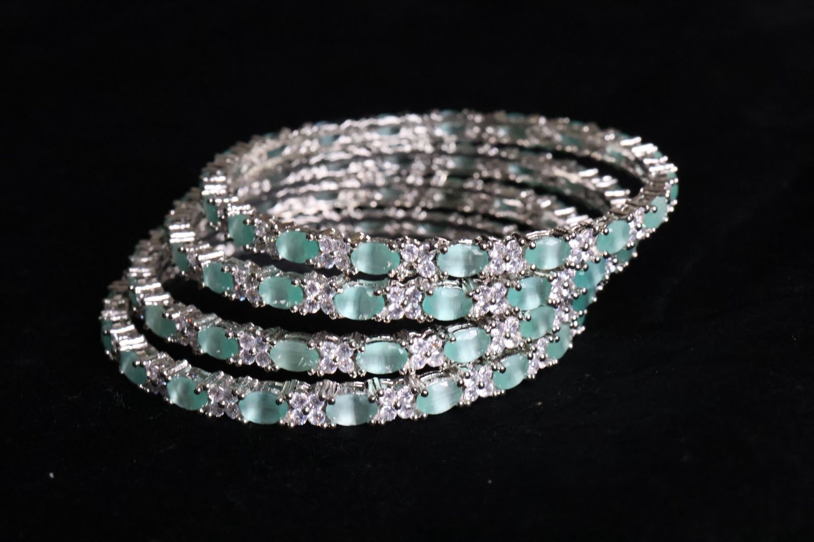 The Aureline Mint Glow Bangle Set is a refreshing blend of soft color and sparkling brilliance. Each bangle features mint-green stones beautifully paired with fine CZ accents, creating a delicate yet striking look. Perfect for festive occasions, evening wear, or adding a hint of charm to your everyday style.