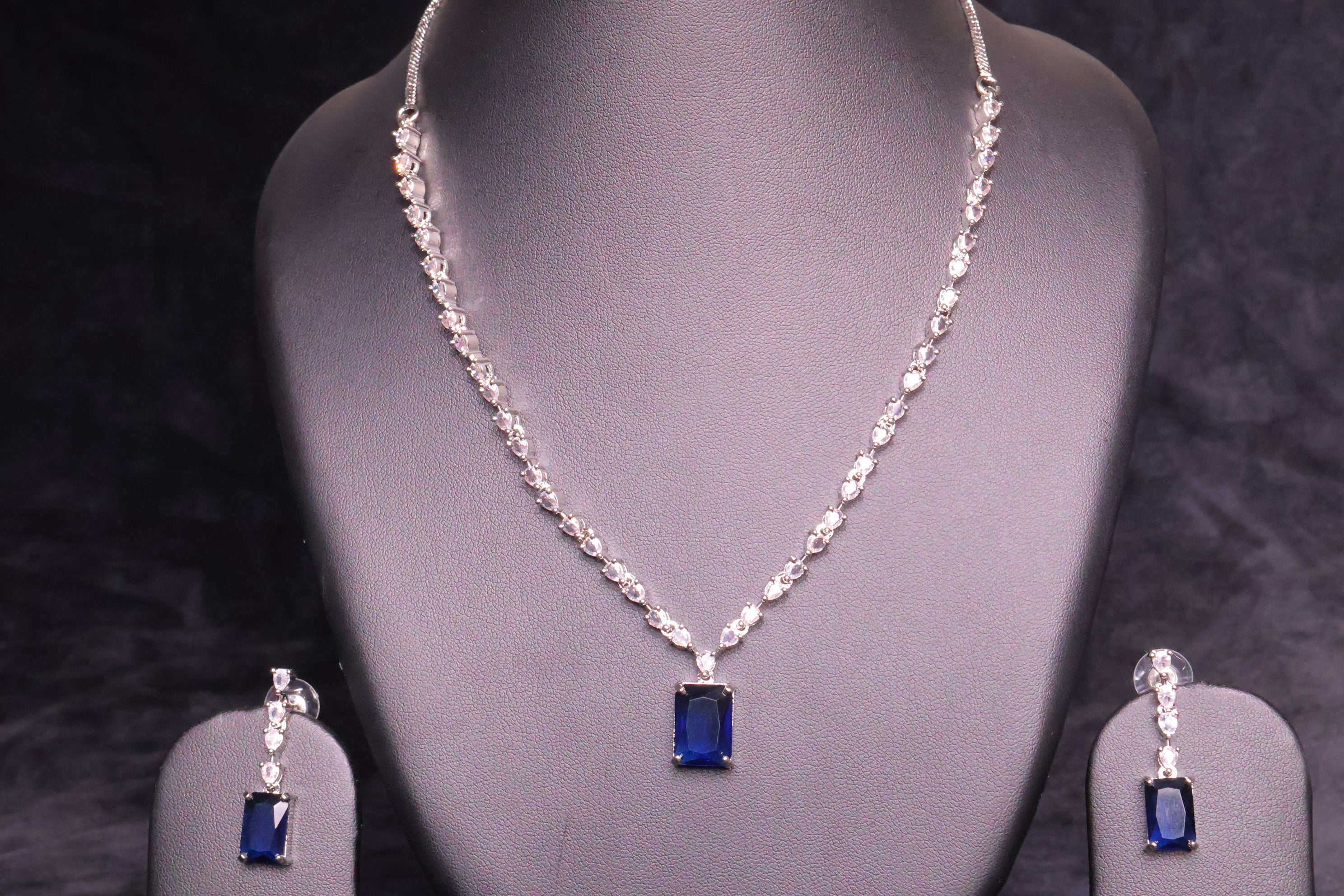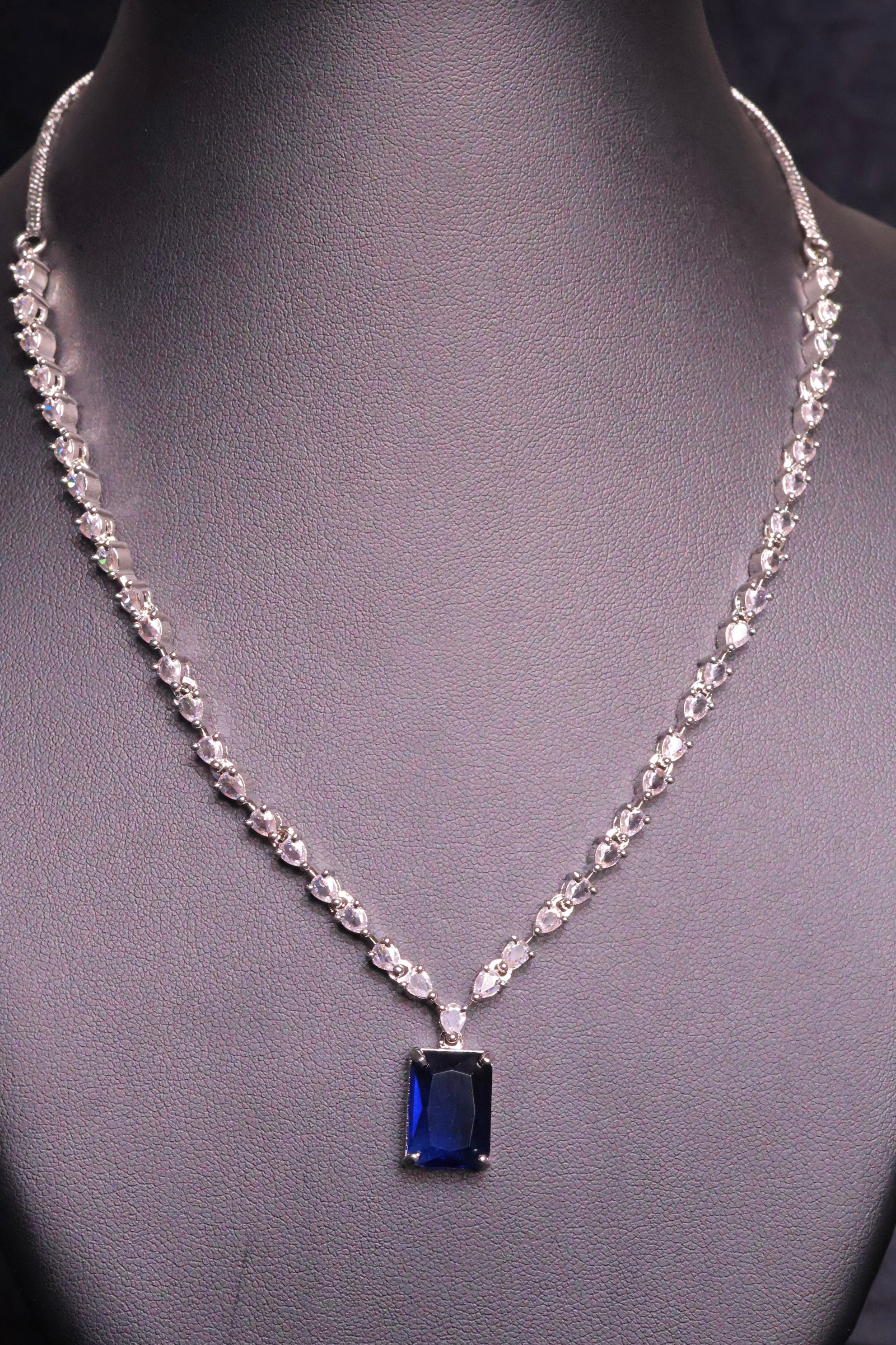 The Elara Sapphire Radiance Necklace Set captures pure sophistication with its sleek design and deep sapphire-blue stone centerpiece. Surrounded by shimmering CZ crystals along the chain, this piece adds a royal charm to any attire.