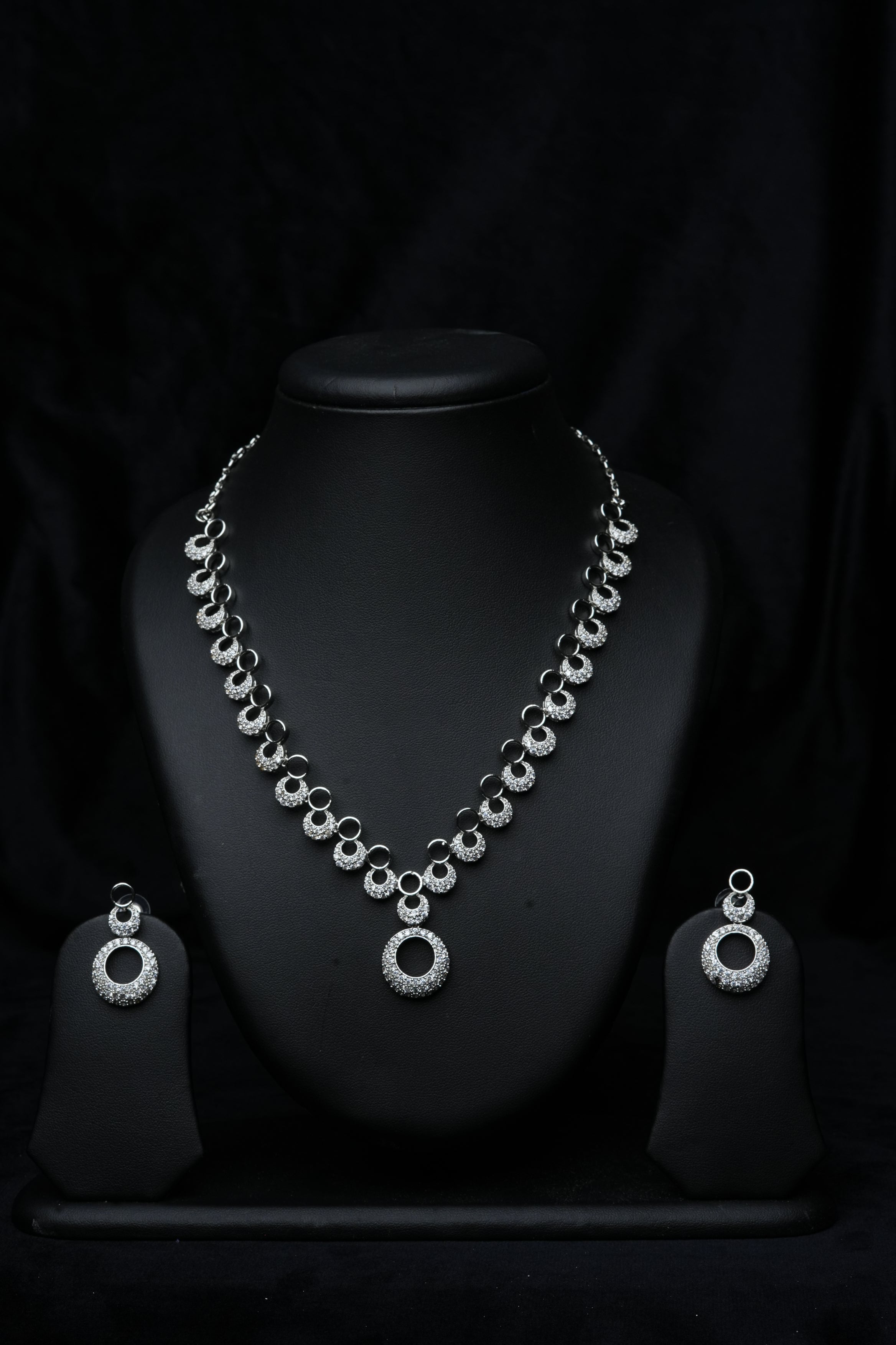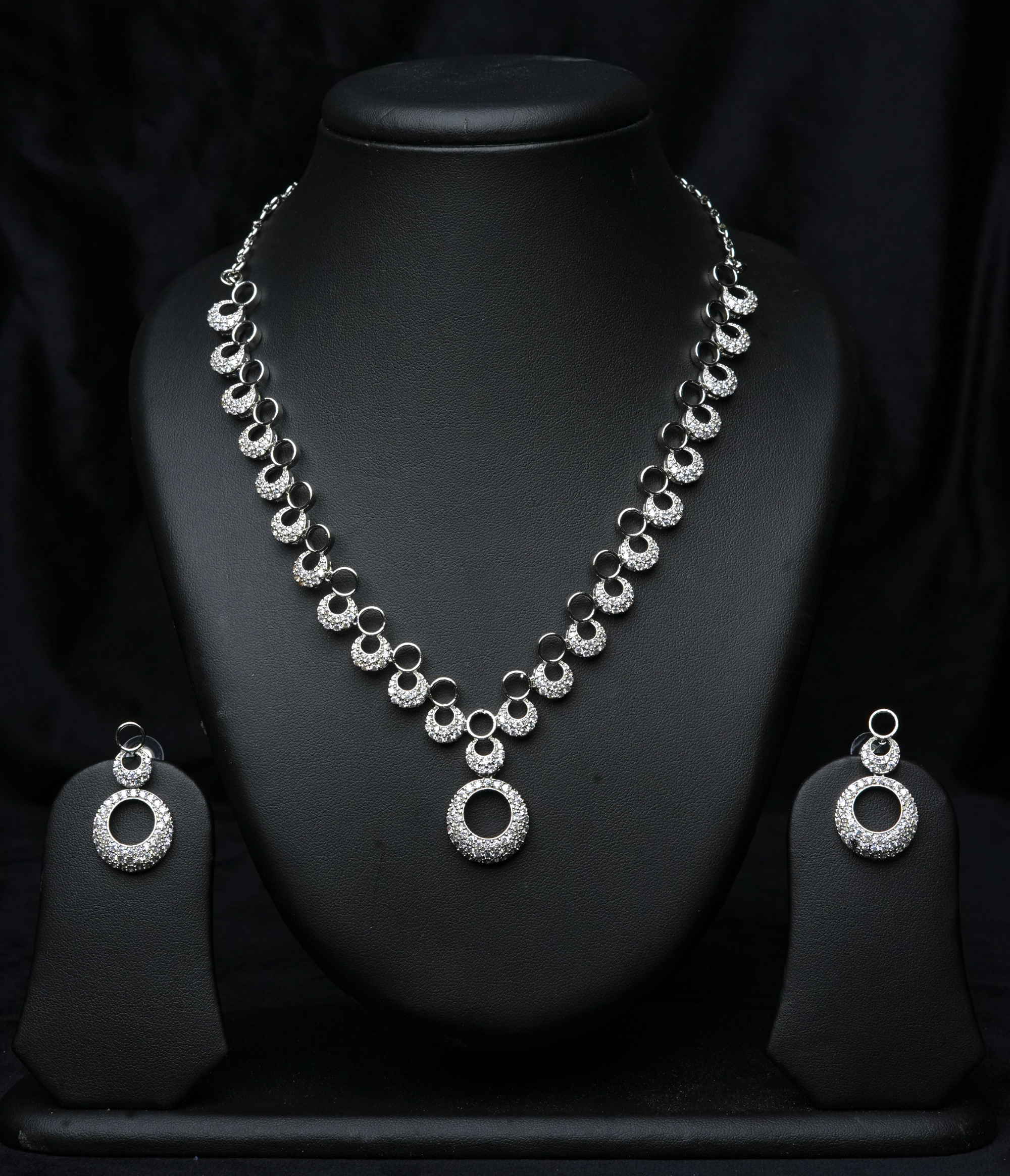 Radiate timeless charm with the Eternal Halo Necklace Set, featuring stunning circular motifs symbolizing unity and grace. Each halo is intricately embedded with Cubic Zirconia (CZ) stones that sparkle brilliantly under every light, exuding elegance and sophistication. Perfect for festive occasions or evening soirées, this piece adds a refined sparkle to any outfit.