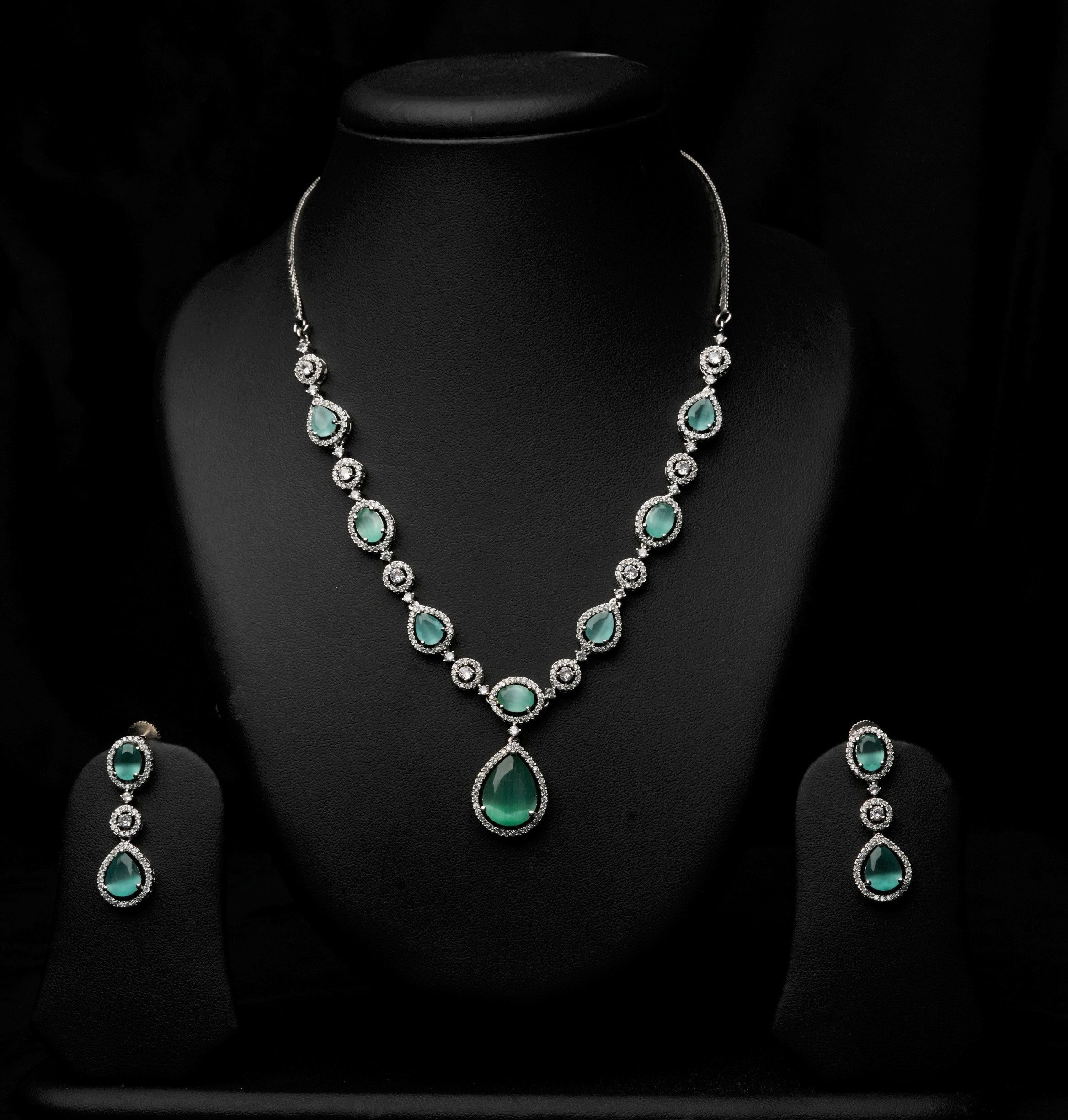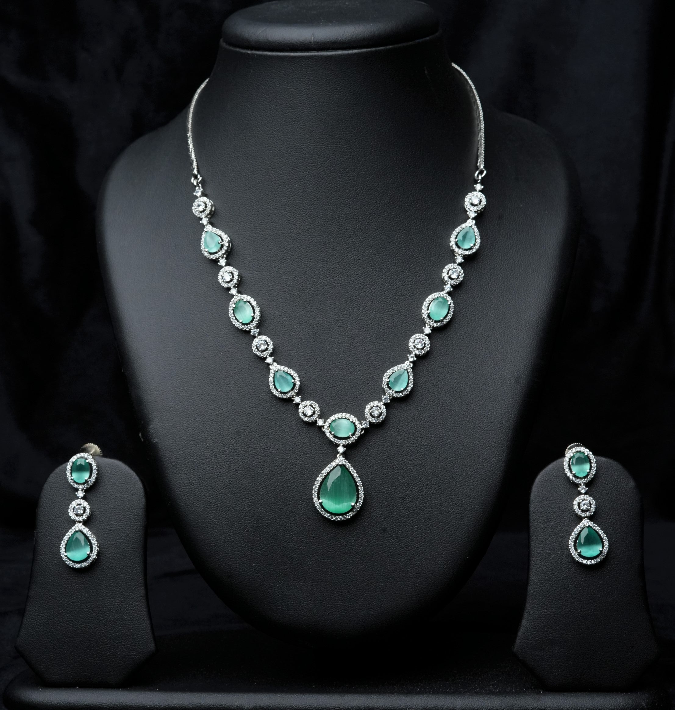 Add a touch of refined sophistication with this exquisite Mint Glow Necklace Set, featuring radiant mint-hued cubic zirconia (CZ) stones delicately bordered with shimmering accents. The soothing color paired with a timeless design makes it a perfect choice for festive wear and special occasions.