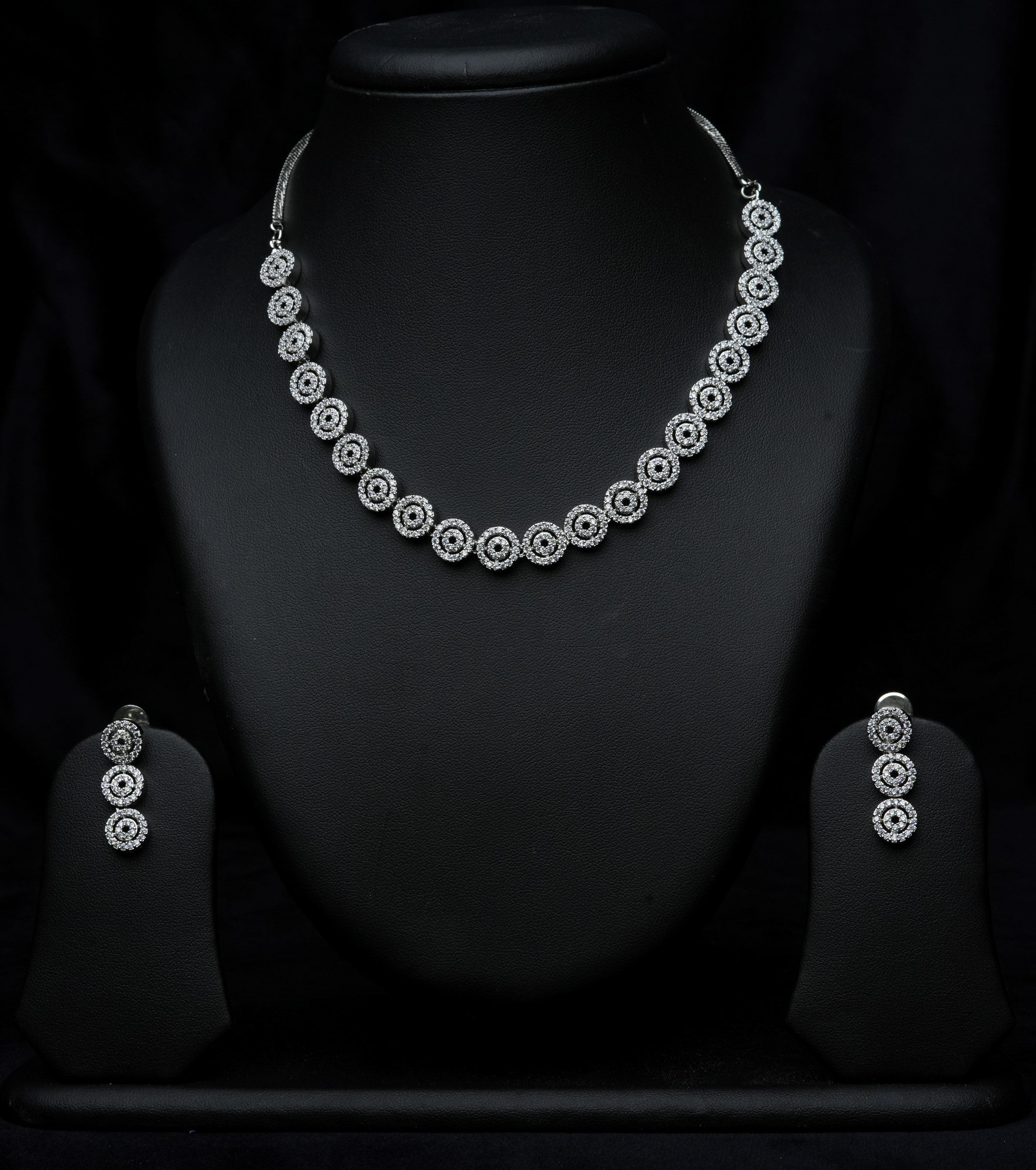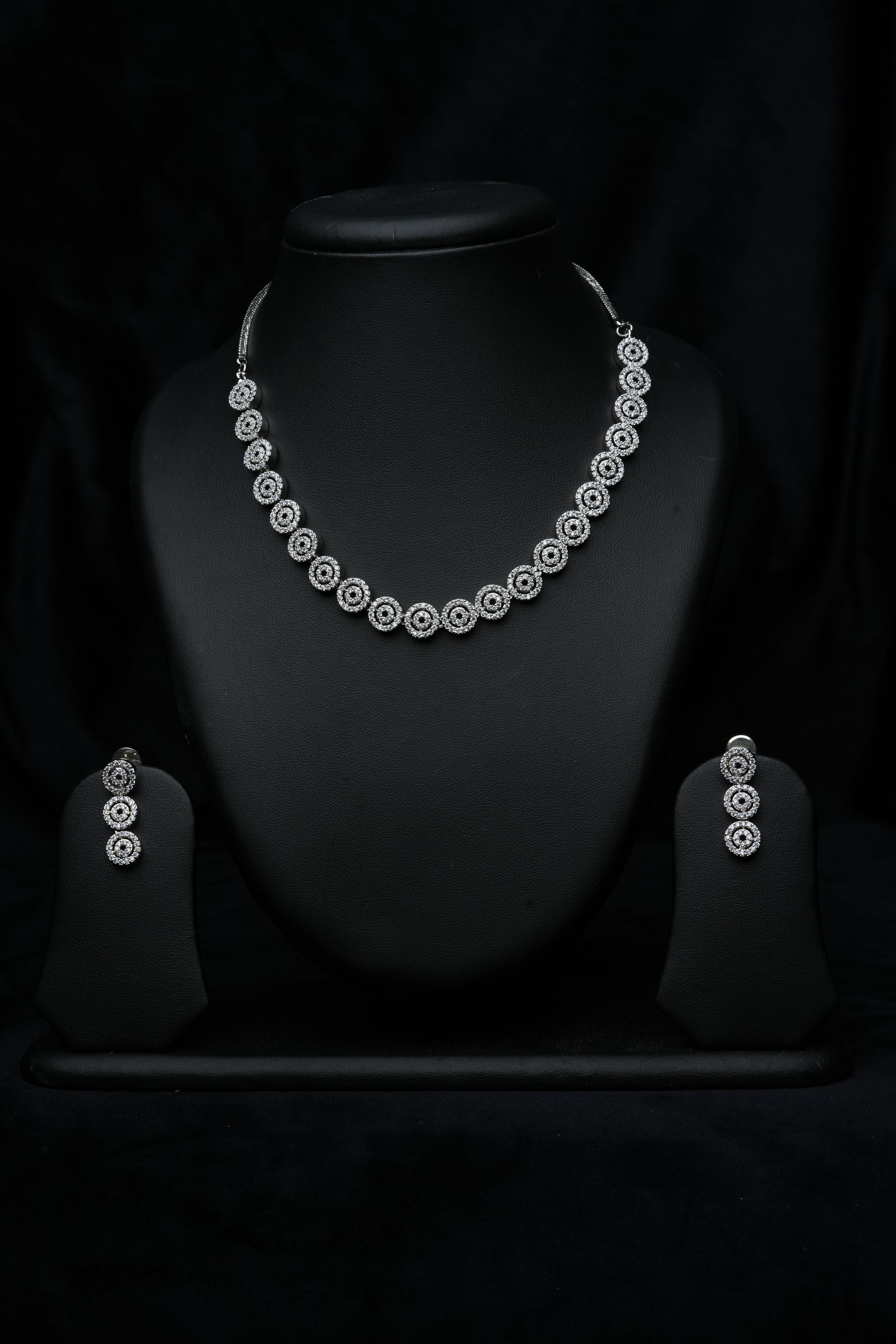 The Radiant Aura Necklace Set showcases timeless elegance with its intricate circular floral motifs, each adorned with sparkling white Cubic Zirconia (CZ) stones. Designed to capture light beautifully, this silver-plated masterpiece adds a touch of refined charm to any occasion. Paired with matching earrings, it’s the perfect blend of luxury and sophistication.