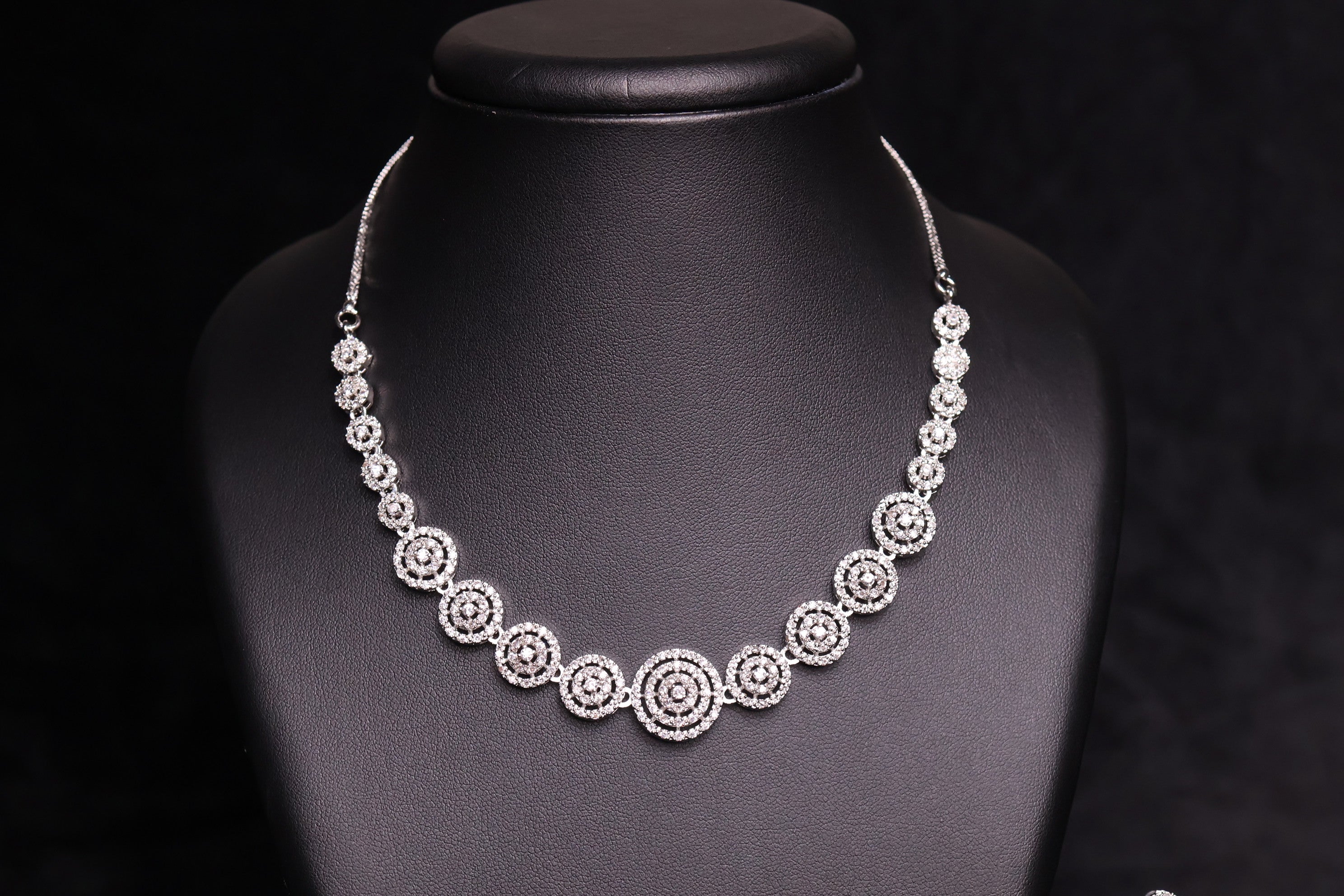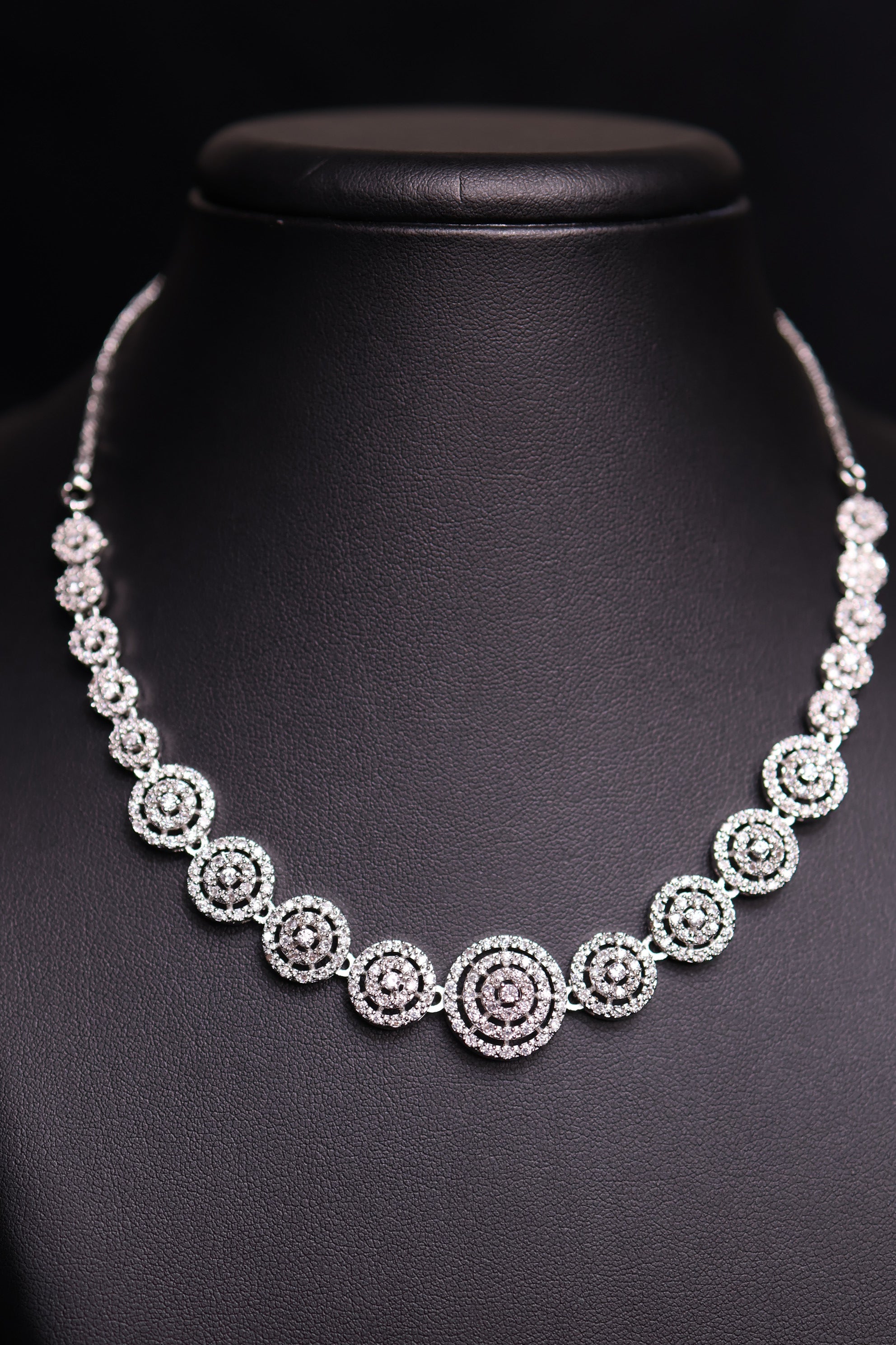 The Radiant Spiral CZ Necklace Set is a stunning blend of sophistication and sparkle. Designed with intricate circular motifs adorned with brilliant white Cubic Zirconia stones, this set reflects timeless elegance. The silver-plated finish adds a modern touch, making it perfect for weddings, festive occasions, or evening parties.