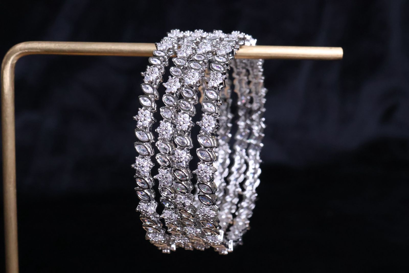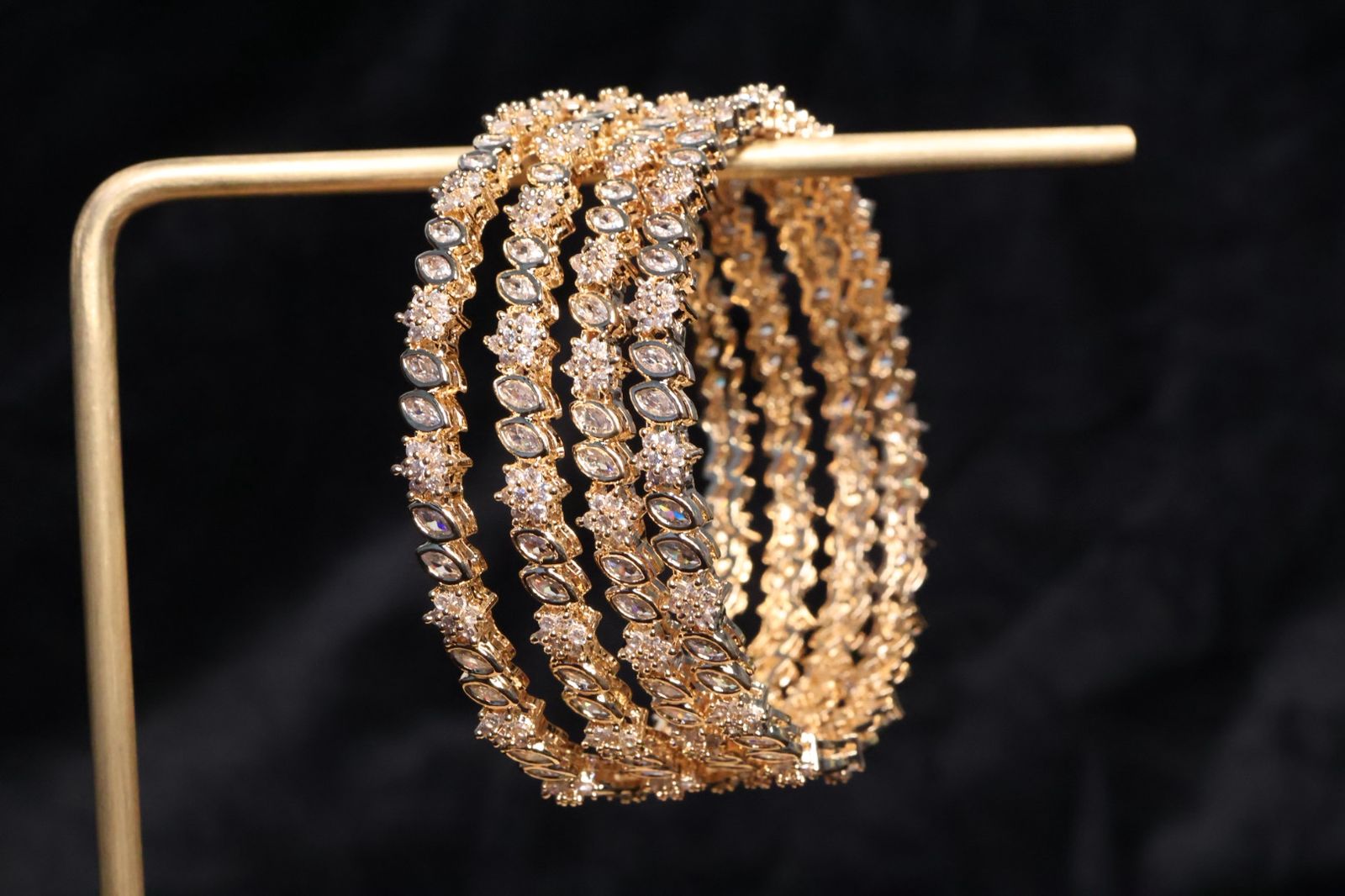 The Adira Crystal Bloom Bangle Set is a stunning display of sparkle and elegance. Crafted with marquise-cut CZ stones in a floral-inspired design, these bangles radiate sophistication with every turn.