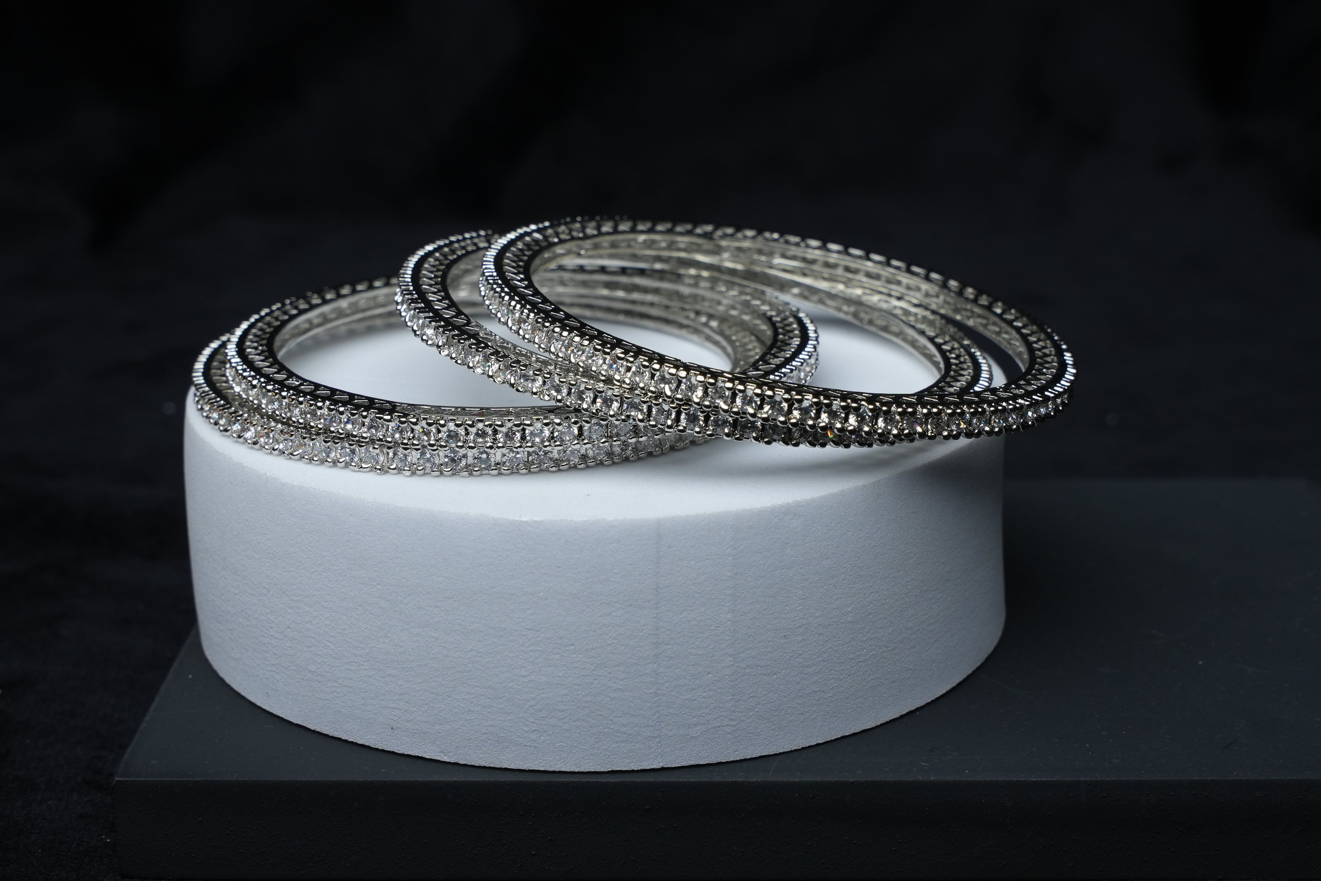 Designed with rows of shimmering CZ stones, these bangles radiate a refined sparkle that elevates any outfit — be it festive, bridal, or casual chic. The silver finish adds a modern touch while keeping it timelessly elegant.