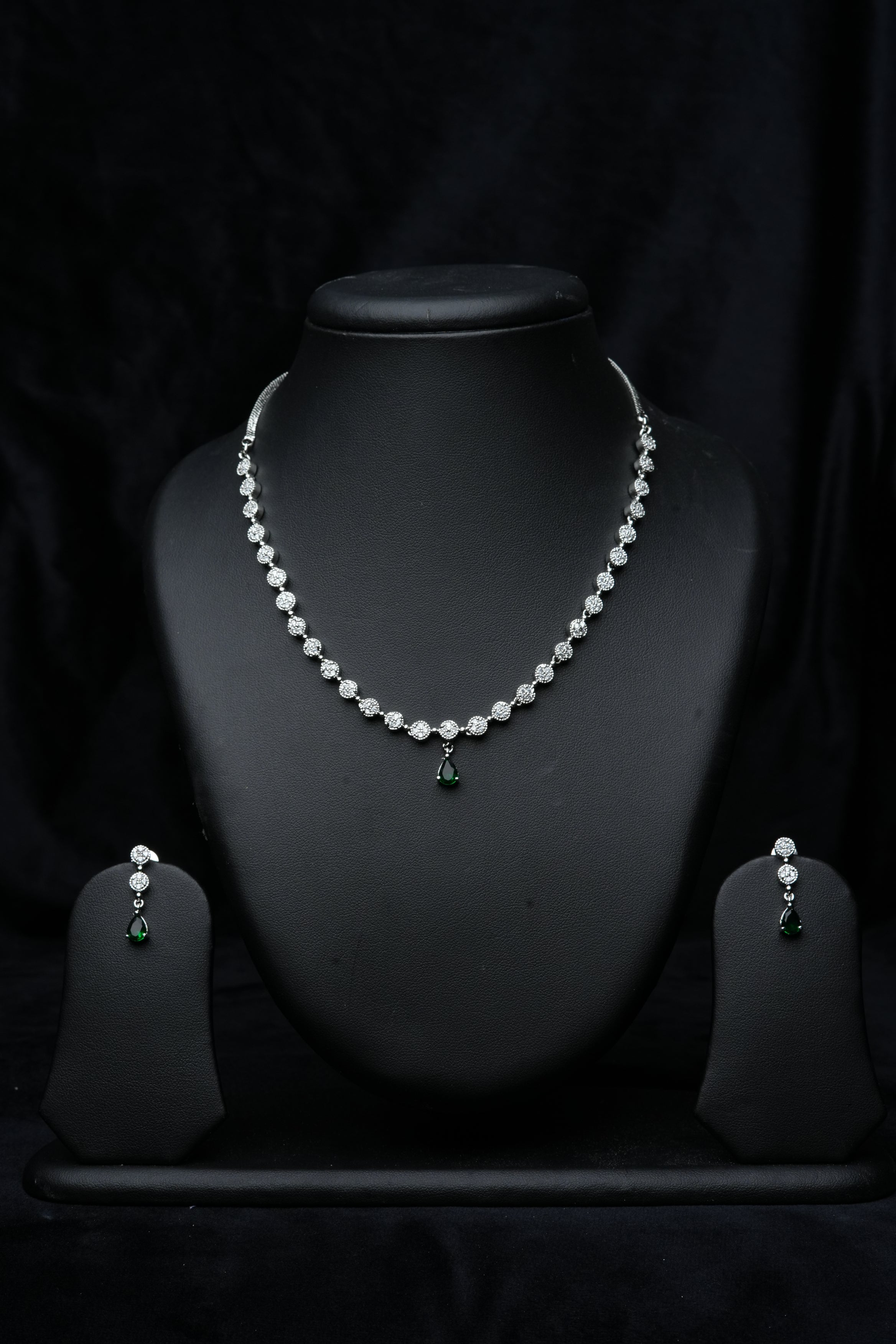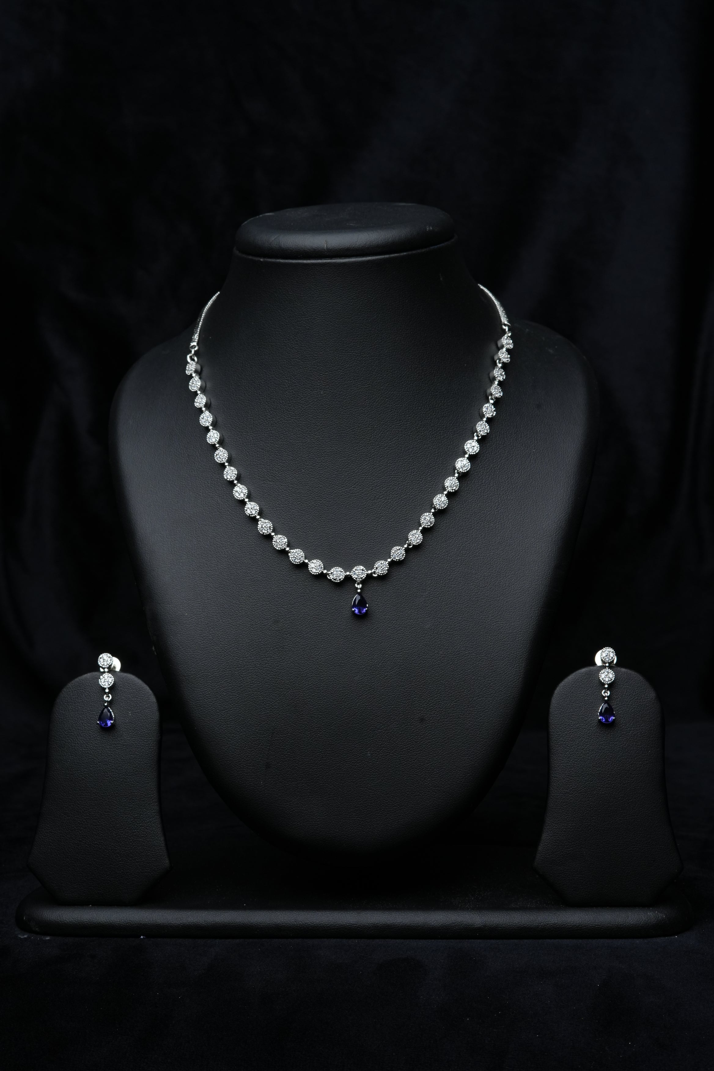 An elegant Cubic Zirconia (CZ) necklace set designed to add a refined sparkle to your special moments. Crafted on a premium brass base, this timeless design features round-cut stones with a delicate teardrop pendant for a graceful finish. The matching earrings enhance its subtle sophistication, making it perfect for festive occasions, weddings, and formal gatherings.