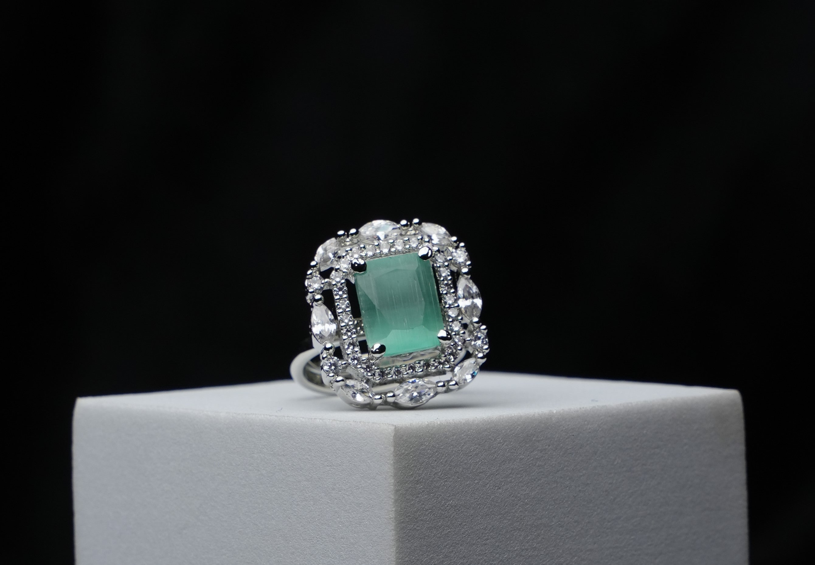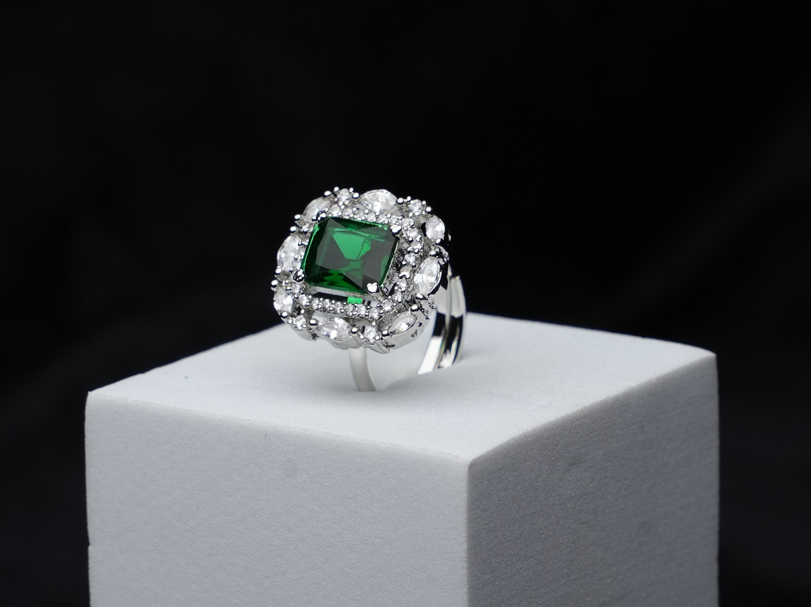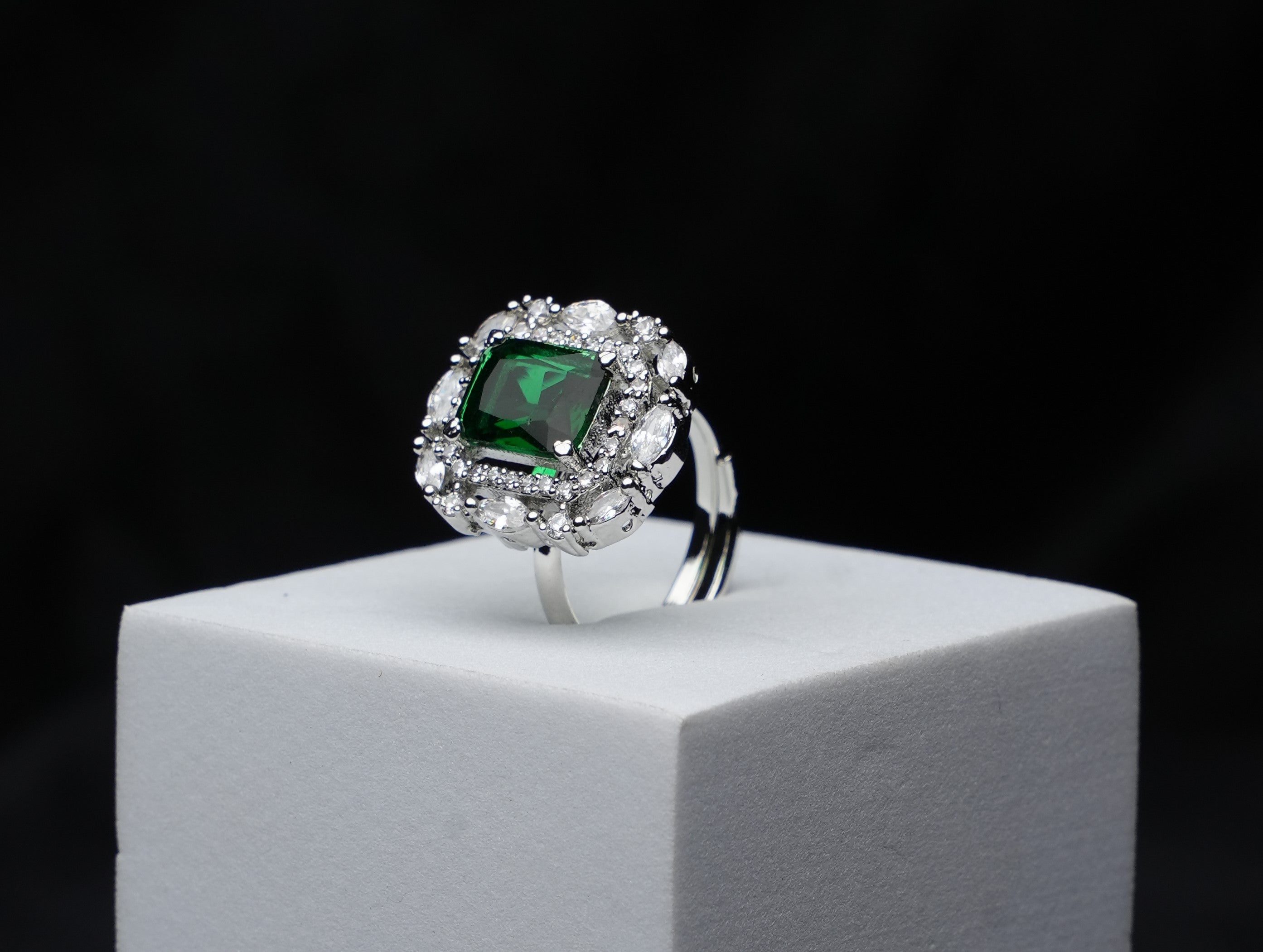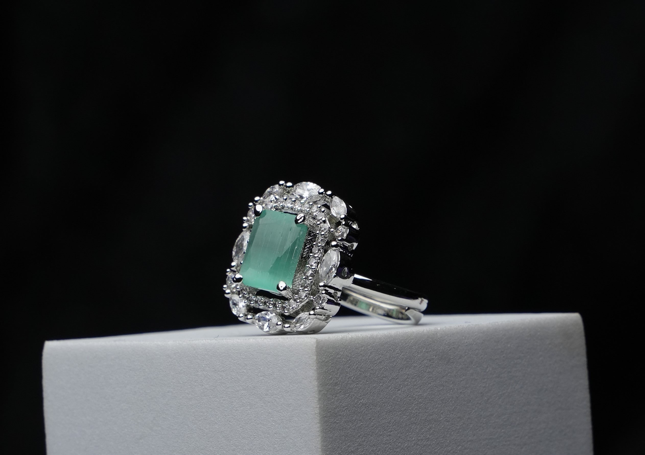 Each ring features a vibrant emerald-cut gemstone at its center, surrounded by a sparkling halo of premium CZ diamonds that radiate brilliance from every angle.