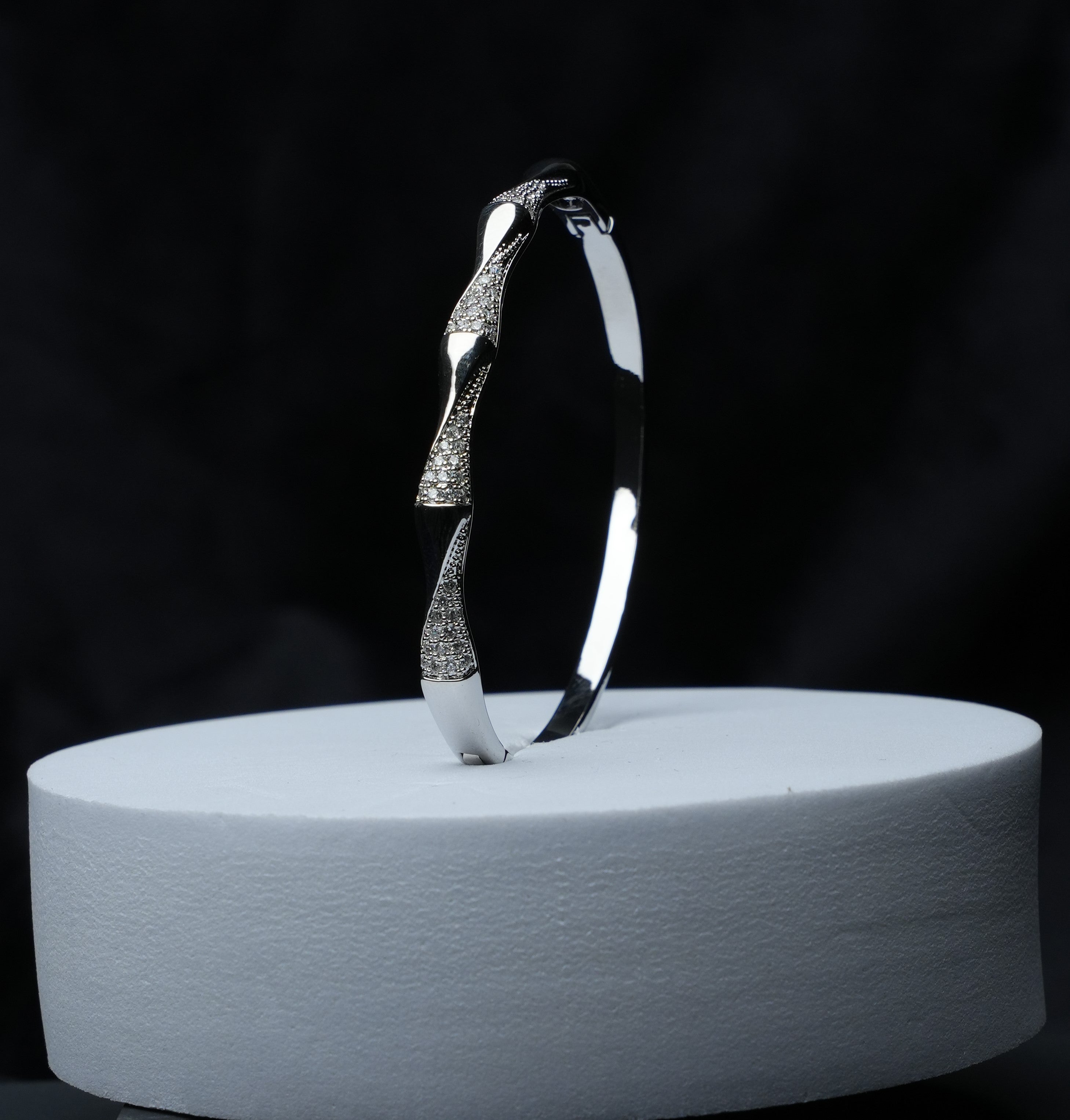 The gentle twist of polished metal and shimmering CZ stones creates a rhythmic flow of light — bold, refined, and irresistibly graceful.